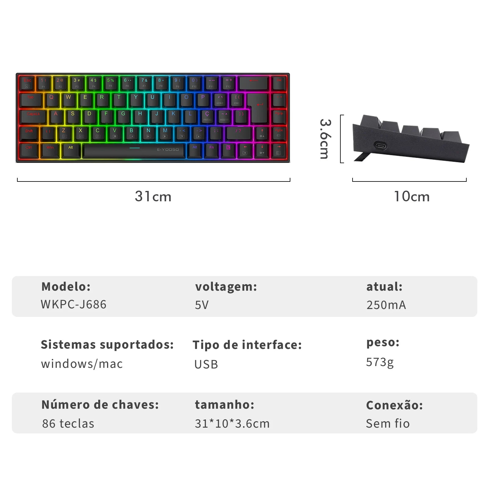 Design Compacto: Layout 68 teclas otimizado (economiza espaço sem sacrificar funções essenciais) e estrutura durável em ABS.